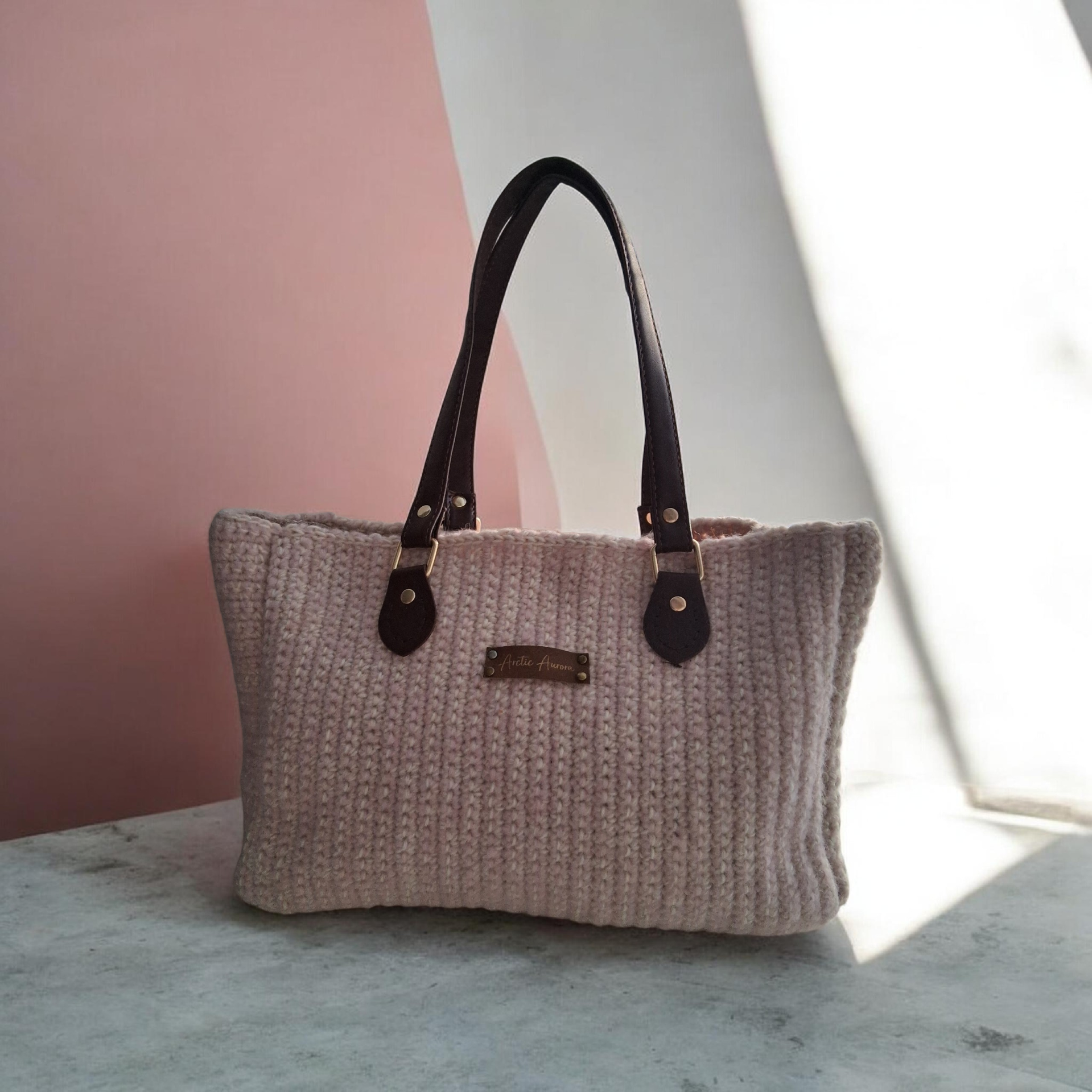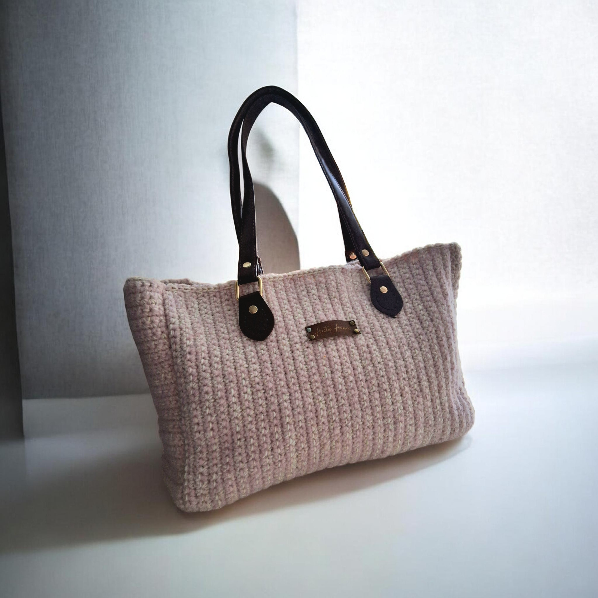 Virkattu kassi. Valmistettu villa ja angora langasta. lanka mix. Laukun kahvat PU nahkaa.