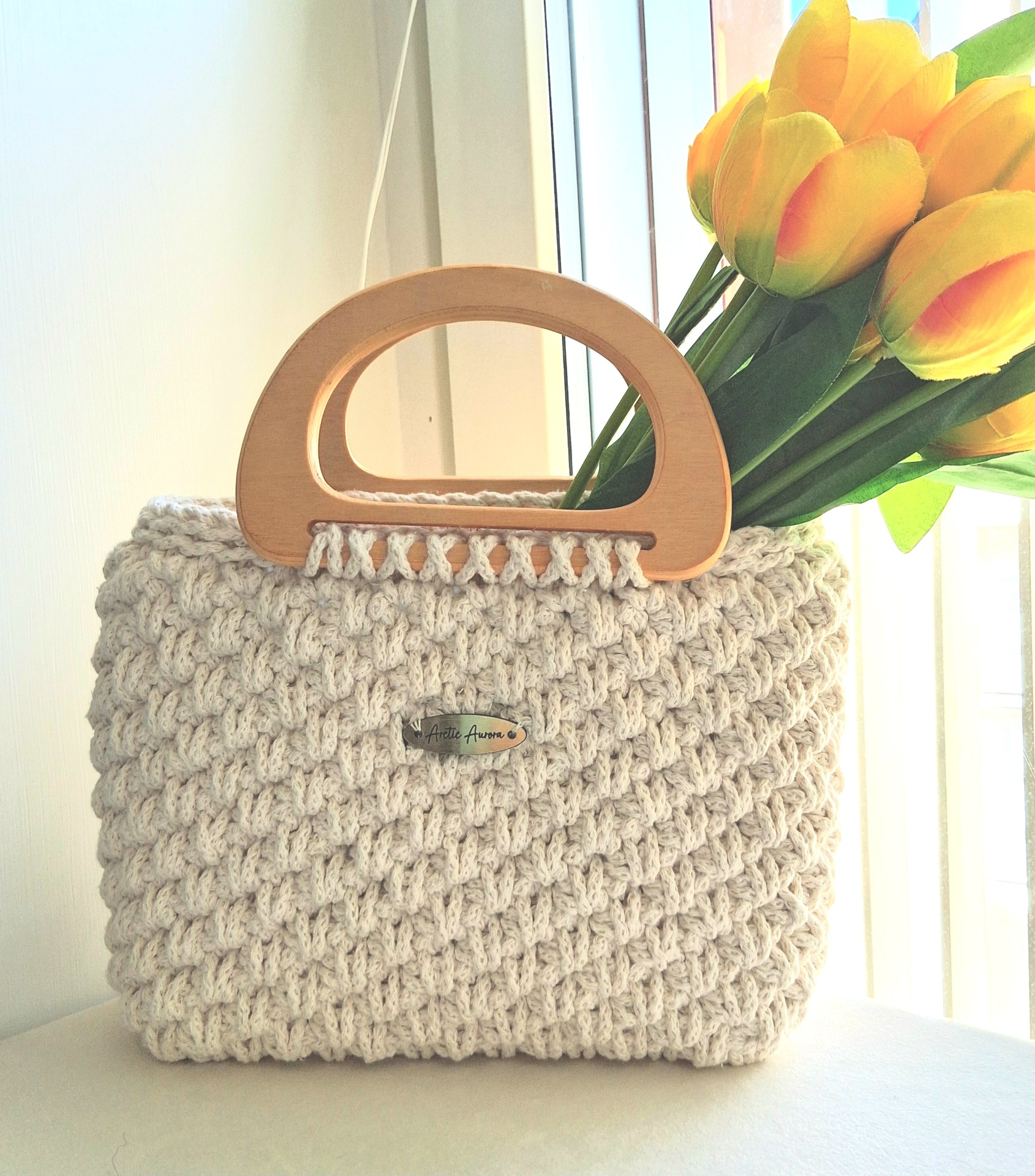Kesäinen pieni korilaukkuq, valmistettu suomalaisvalmisteisesta kierrätys langasta.puukahvat.